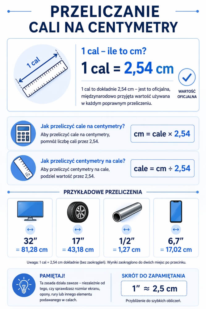 1 cal to dokładnie 2,54 cm – jest to oficjalna, międzynarodowo przyjęta wartość używana w każdym poprawnym przeliczeniu. Aby zamienić cale na centymetry, należy pomnożyć liczbę cali przez 2,54. Ta zasada działa zawsze – niezależnie od tego, czy sprawdzasz rozmiar ekranu, opony, rury czy innego elementu podawanego w calach.